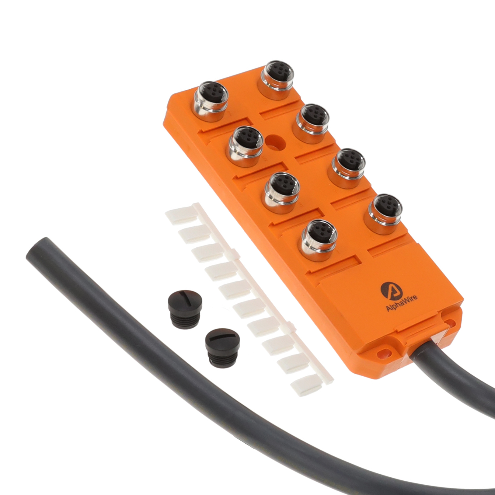 Alpha Wire 911-10M-NC032 is an M12 plastic actuator box from the 911 series, designed for robust sensor interface applications. This orange, dust-tight and waterproof component features 8 connector openings, utilizing M12 shell size inserts for secure circular connector interface. Constructed from durable Thermoplastic Polyurethane (TPU), it offers reliable performance in harsh environments. This component is commonly employed in industrial automation, robotics, and factory floor connectivity solutions where dependable signal transmission and environmental protection are critical.