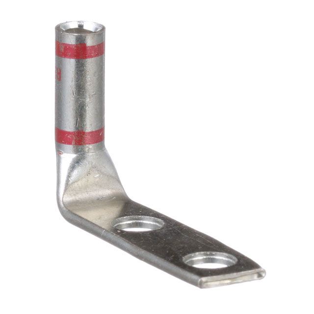 Panduit Corp Pan-Lug™ LCCX8-14BF-L is a non-insulated, rectangular tongue terminal designed for 8 AWG wire. This component features a 1/4 stud size with a tab thickness of 0.070 inches (1.78mm) and two stud holes for secure mounting. The overall width is 0.480 inches (12.19mm). Termination is achieved via crimp to the barrel. Mounting options include free hanging (in-line) and right angle configurations. This terminal is commonly used in industrial power distribution and electrical equipment manufacturing. Packaged in bulk.