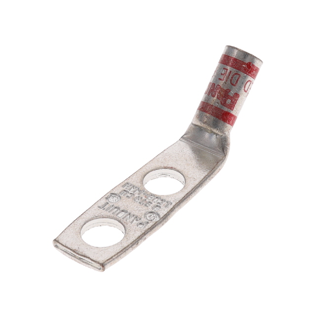 Panduit Corp Pan-Lug™ LCD8-14AH-L is a non-insulated, rectangular tongue terminal connector designed for 8 AWG wire. This component features a Crimp termination style with a barrel for secure wire connection. The terminal has two stud holes, accommodating a 1/4 Stud size with a tab thickness of 0.070 inches (1.78mm). The overall width across the outer edges is 0.480 inches (12.19mm). Mounting is supported via a free hanging (in-line) configuration, with an option for a 45° angle. Commonly utilized in power distribution and electrical interconnect applications, this Panduit Corp terminal is supplied in bulk packaging.