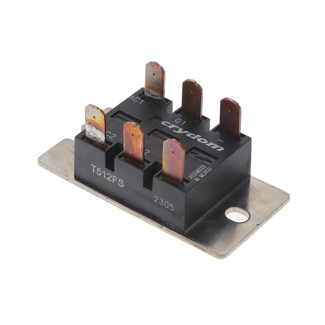 Sensata-Crydom T512FS SCR Module. This power module is designed for high-power switching applications. Featuring a robust SCR module configuration, the T512FS offers reliable performance in demanding environments. Its construction is optimized for efficient thermal management and superior electrical characteristics, making it suitable for industrial power control, motor drives, and power supply applications. The module's inherent design ensures high surge current handling capabilities, crucial for applications with transient load conditions. This component is a critical element in systems requiring precise control of AC power.